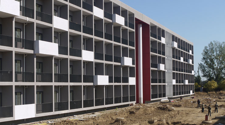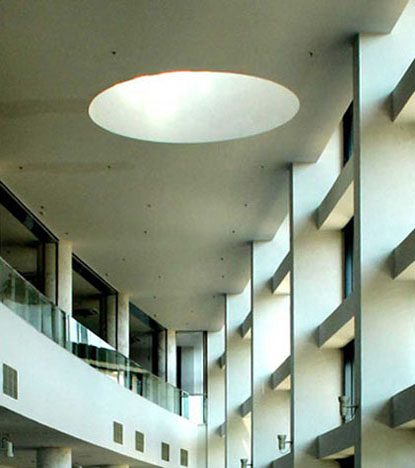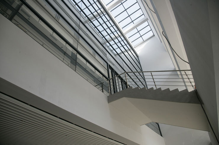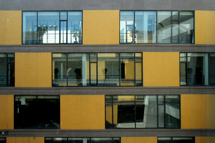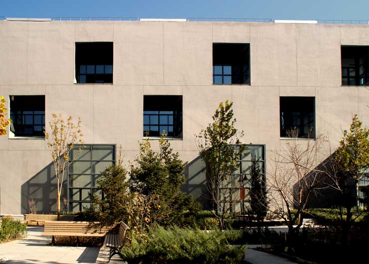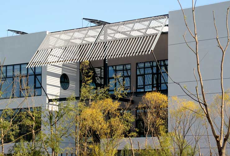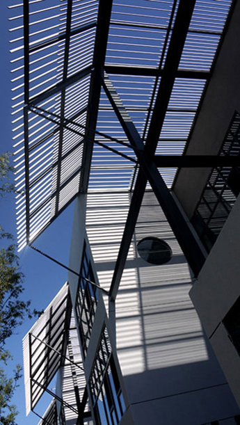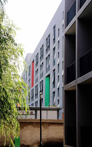 courtyards within. Much attention has been given to the design of east and west-facing facades to protect windows from incoming solar radiation.