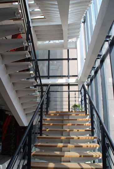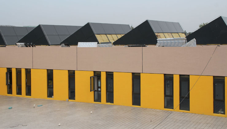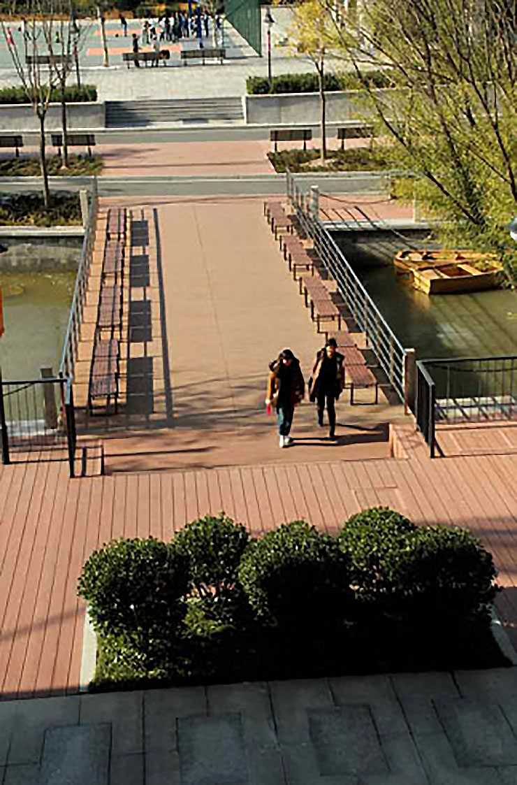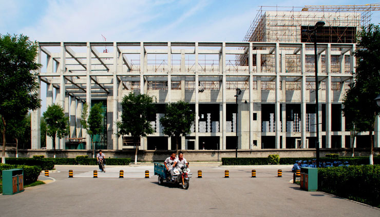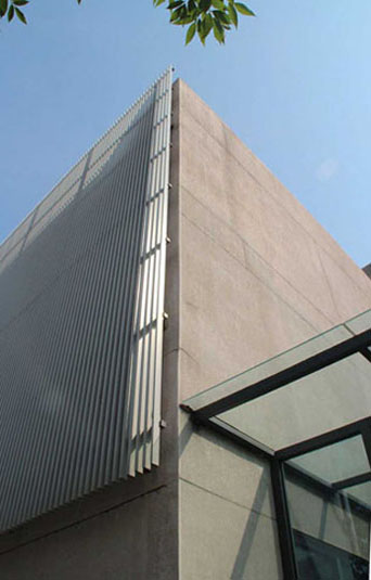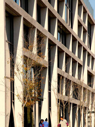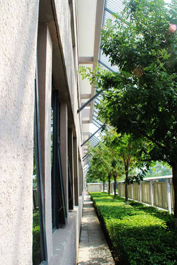 Several methods have been used, such as, reducing the size and number of openings, deeply recessed windows, aluminum louvers, concrete sun shades, etc. Sidewalk trees will also protect people and buildings from Beijing's glaring summer sun, and, at the same time, strengthen the urban feeling.
