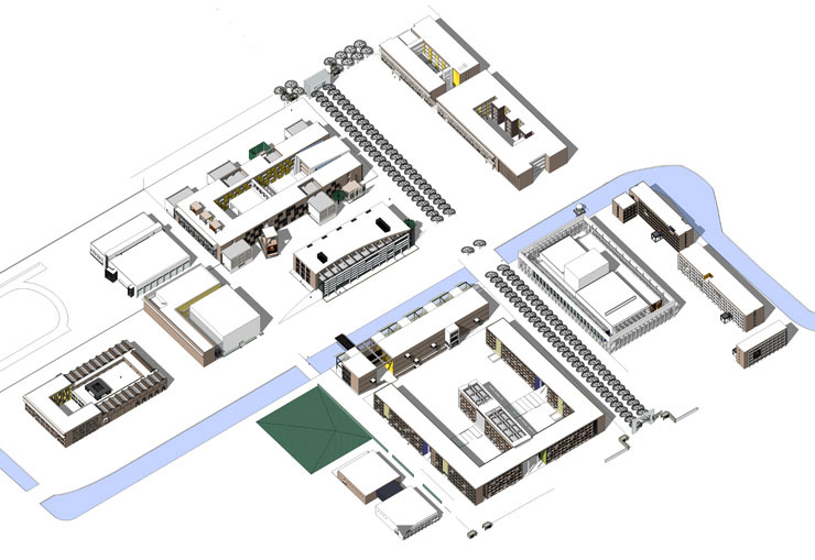 In this campus design, however, north-south aligned buildings are added to achieve continuous, connected urban blocks forming streetscapes between the blocks and