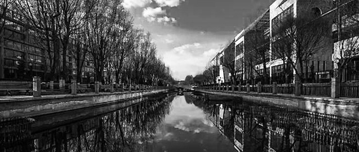 An 18 meter wide, north-south canal divides the site into east and west halves. The site is basically zoned “west” for study and “east” for living. A variety of teaching buildings and the library are all on the west side of the canal and - except for the theater - the dormitories, dining hall facilities, and a service building are all on the east side of the canal.