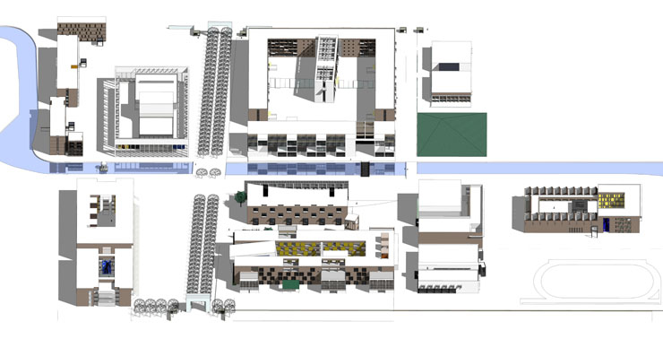 An entry plaza is placed near the northeast corner of the site. Its formal east-west axis intersects the more informal north-south canal axis. At the center of the latter, two of the more “public” buildings, the Library and the Dining Hall, form a campus center, looking at each other across the canal. In better weather, reading and dining extend to the edges of the water.