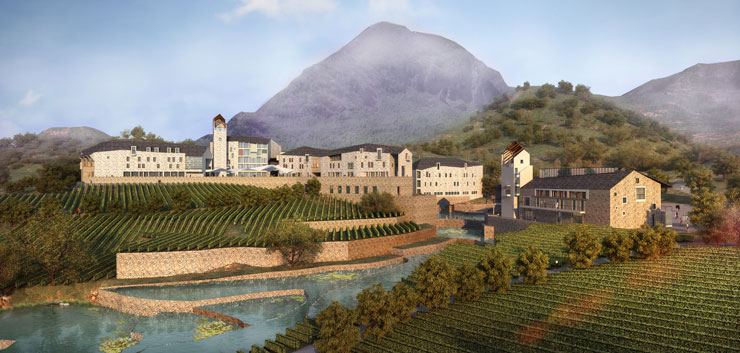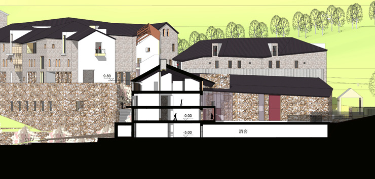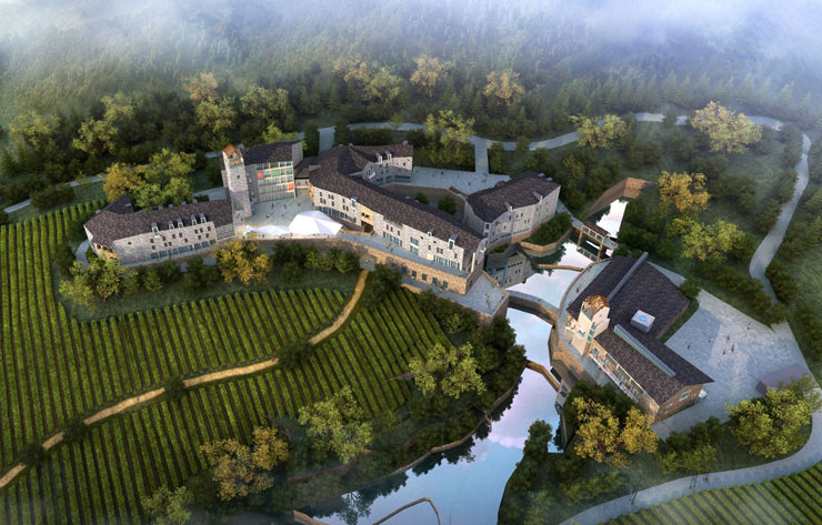 The site is in a valley to the west of central Beijing. The client asked for a resort design that was about 20% winery and the remaining
