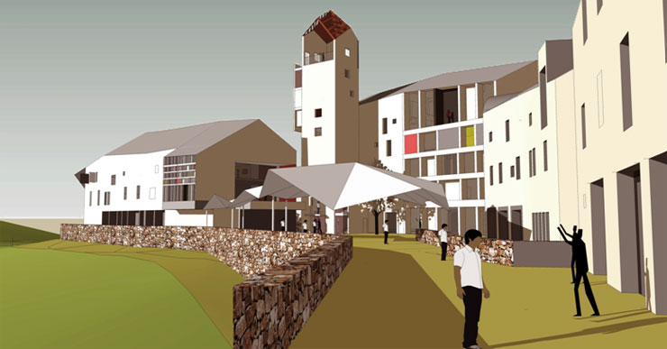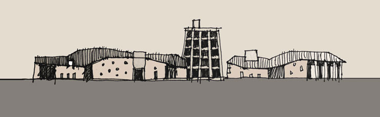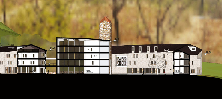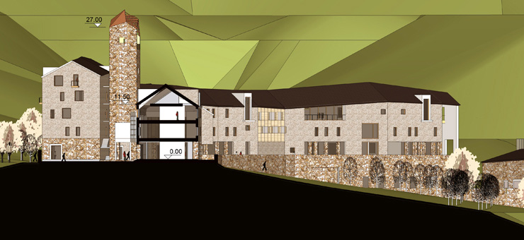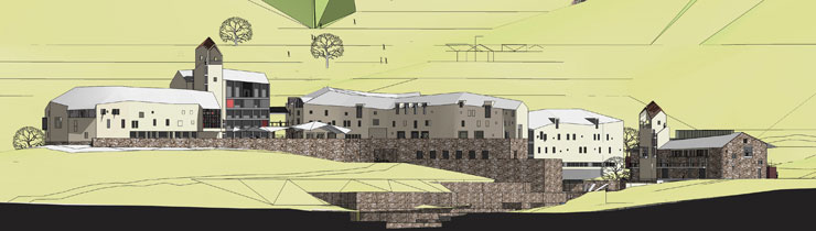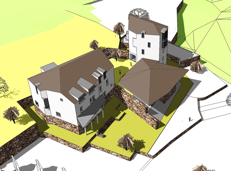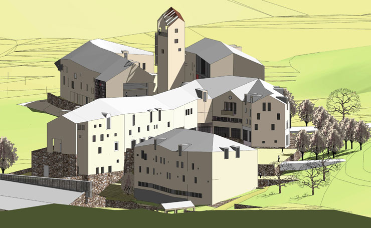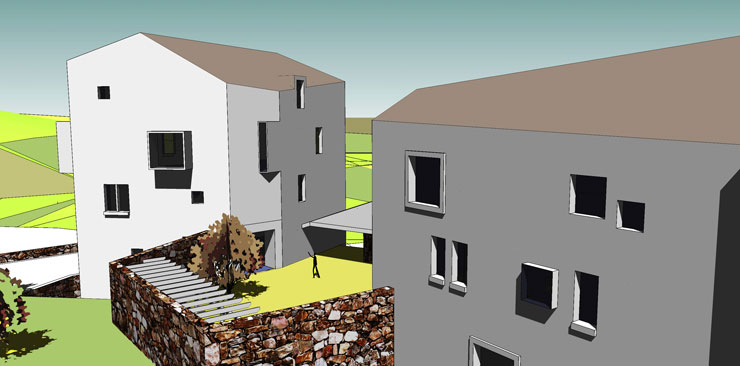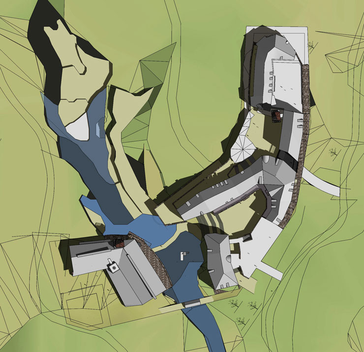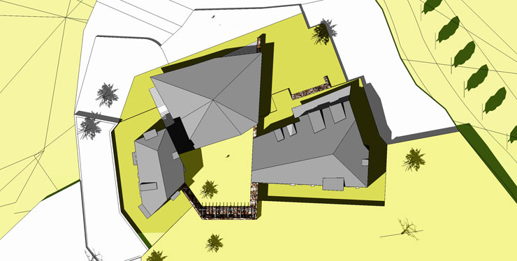 The footprint of the buildings follows the counter lines so none of the volumes are orthogonal. Walls rising from irregular plans result in sloping roofs with