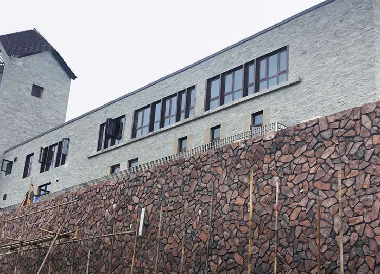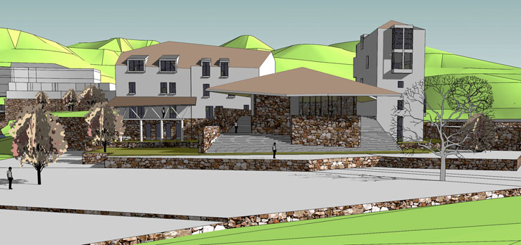 The materials palette is limited to clay roof tiles and walls of local slate.