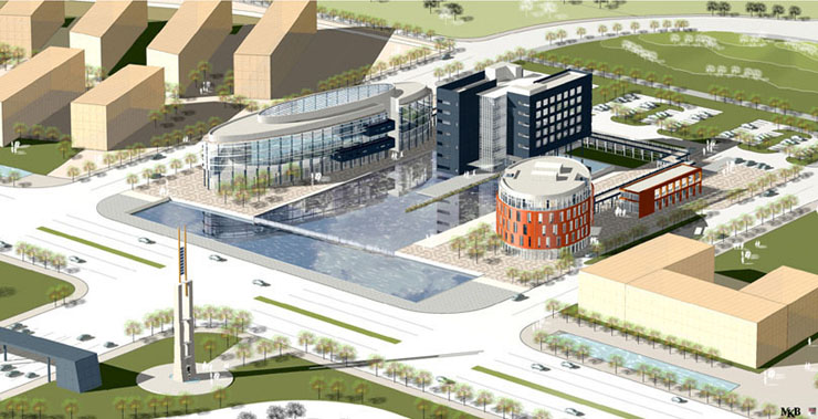 PROGRAM: Site planning and individual building design for an Administration Center, and a ceremonial entrance gate to the Free Trade Industrial Park across the road. Site Planning for management staff and workers.