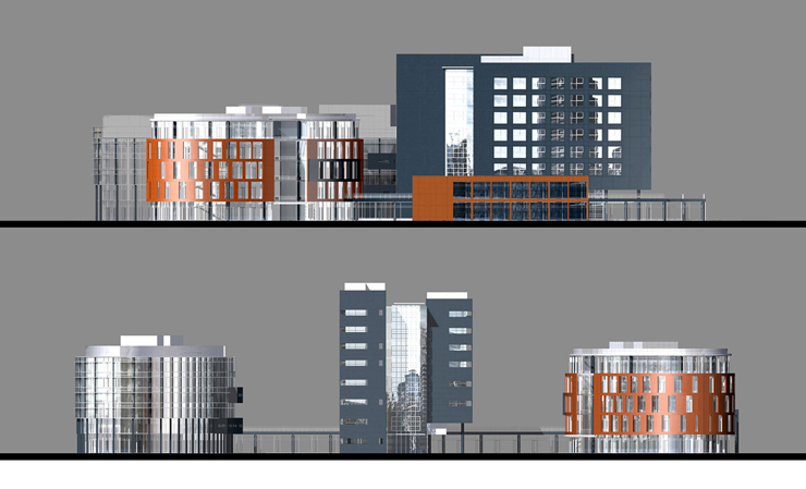 of the ensemble reaches across the road and passes through the main gate of the Free Trade Zone. The