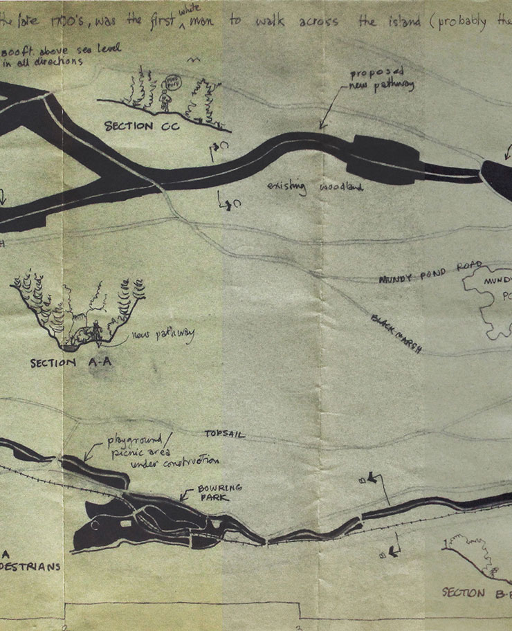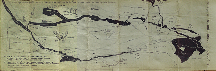 Later, I drew a map envisioning the river as a pedestrian path, linked to other proposed or existing green spaces and paths around the city to form a network.