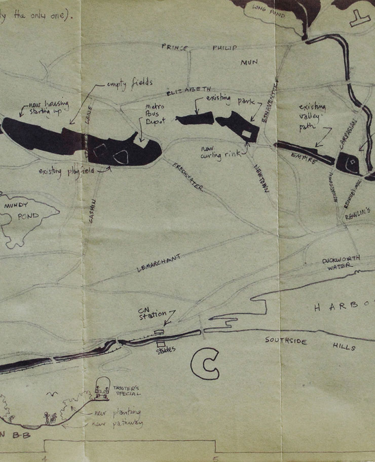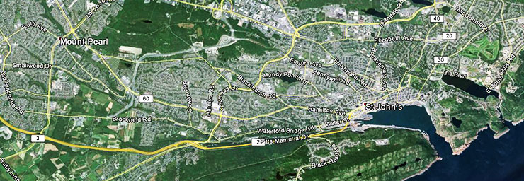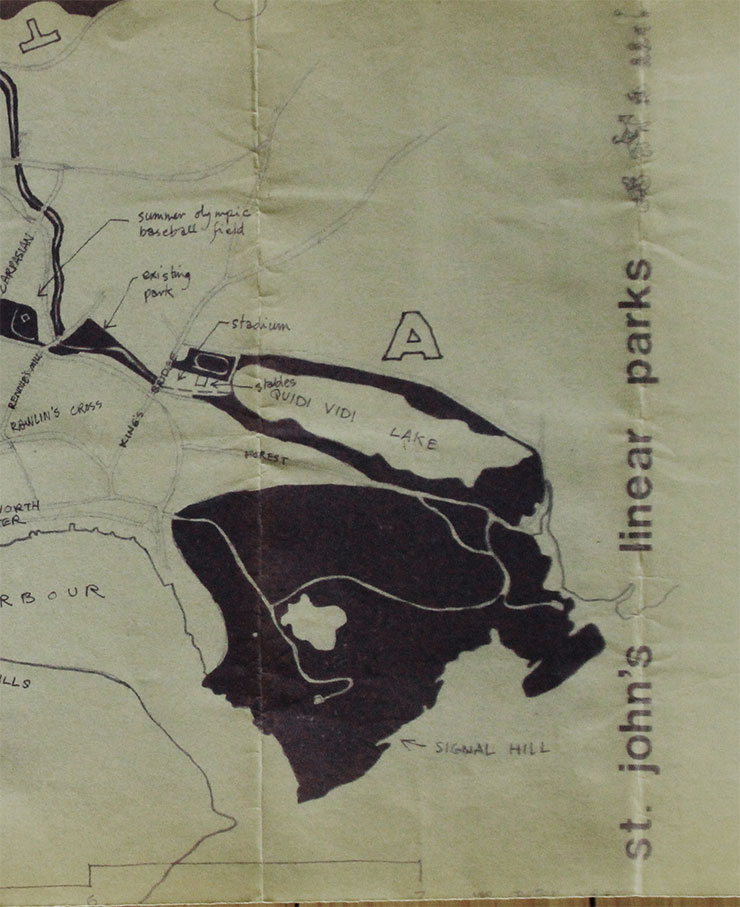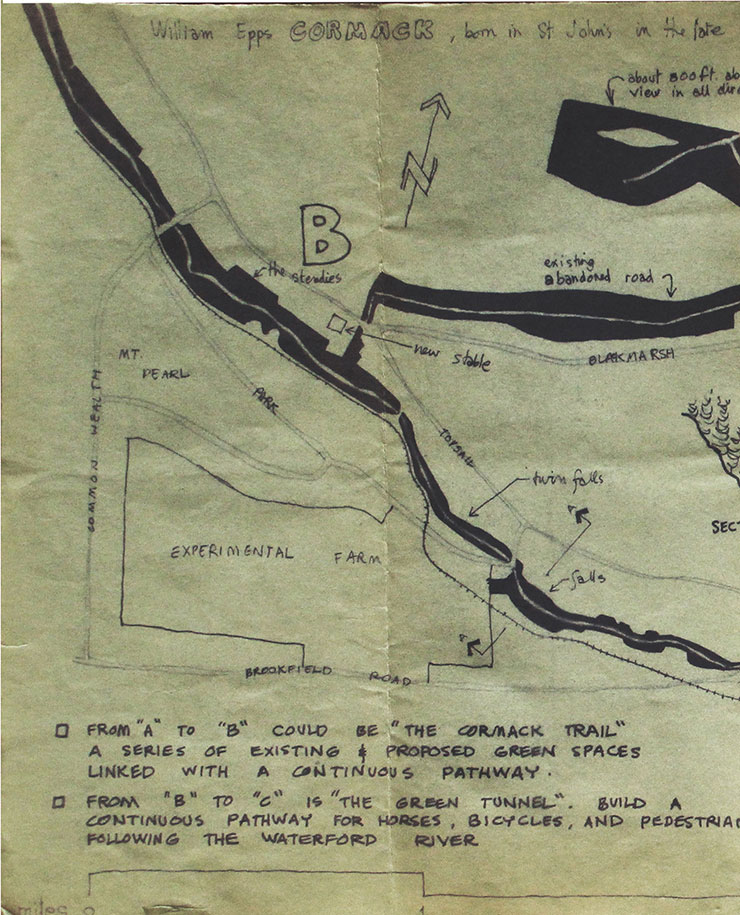 Around 1980, I walked down the Waterford Valley from Mt. Pearl to the Harbour (From B to C on the map below). Mostly I wanted to see whether I could just get through.