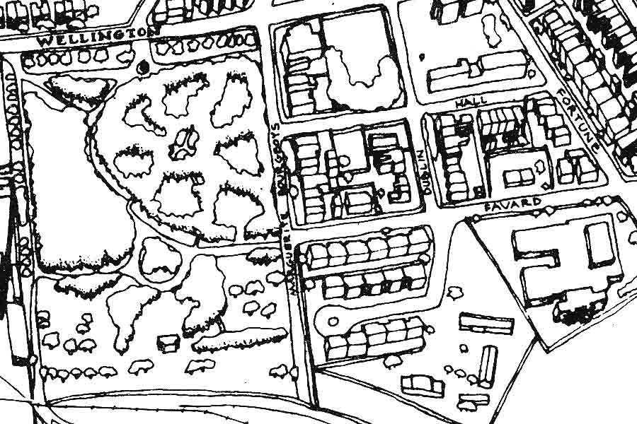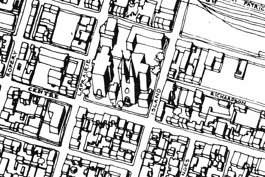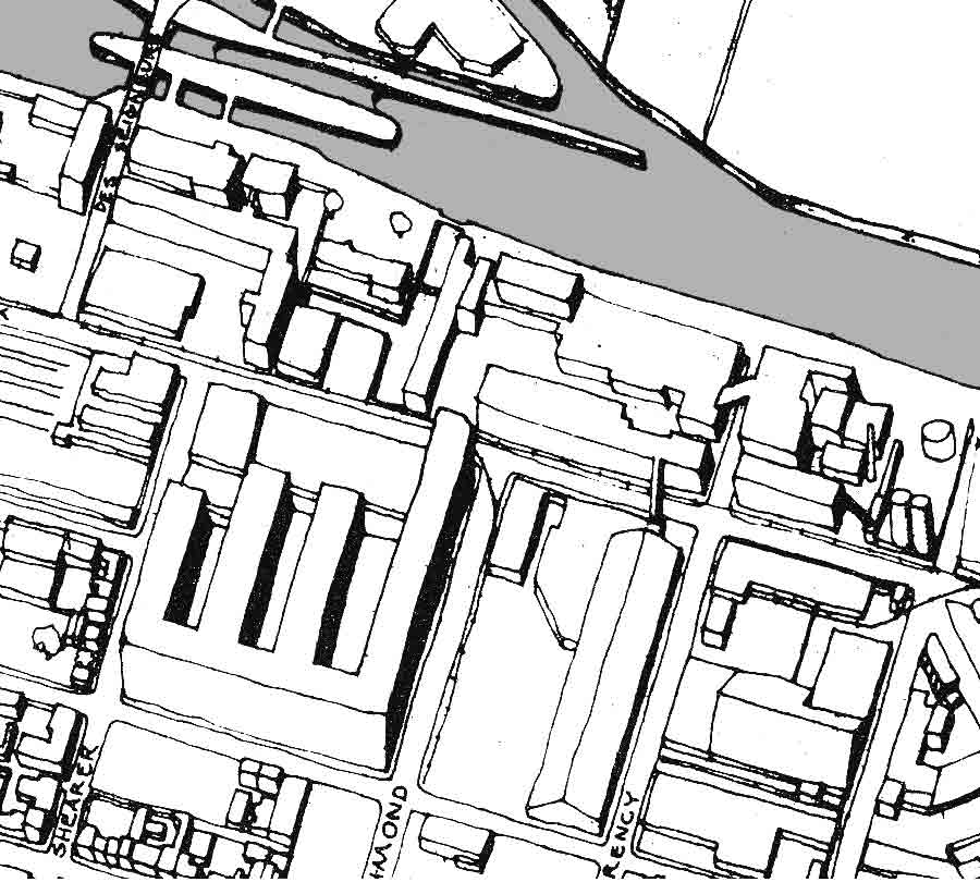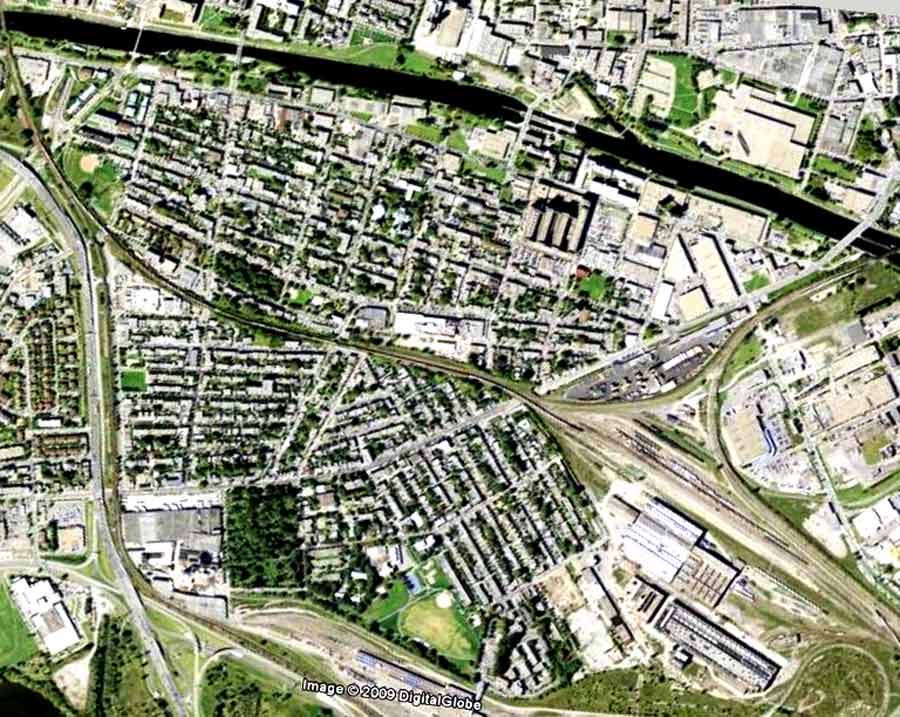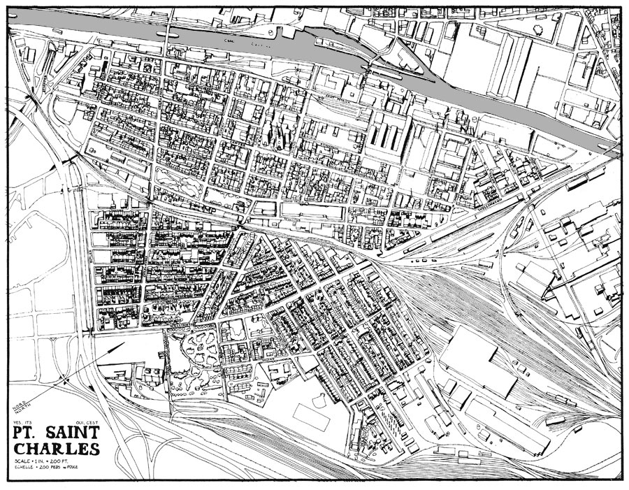 This axonometric map of Pte. St. Charles, a district of Montreal, Canada, was drawn as part of a design course at the School of Architecture, McGill University, in the spring of 1972. Traced over a city map, heights of structures were determined by Pieter Sijpkes and me by riding along all the streets on our bicycles and recording the number of floors of every building. The map was part of a study Pieter and I did of open spaces in the community, with a view to seeing how they might be better used. The study was one activity of the Community Design Workshop, a community-based teaching program initiated by Professor Joe Baker. That summer Pieter and I obtained a federal government grant to hire local students to create adventure playgrounds and vegetable gardens on some of the underused land identified in the study. Our report about this project is online. Below each hand-drawn image is a corresponding Nov, 2009, image from Google Earth.