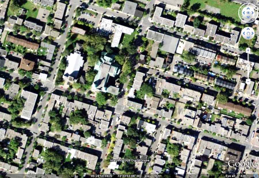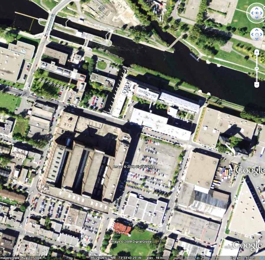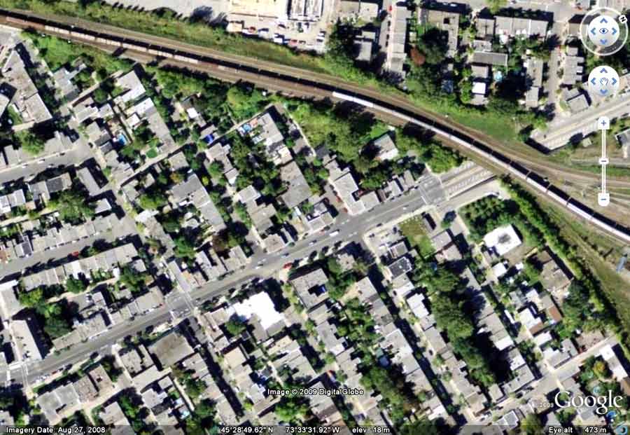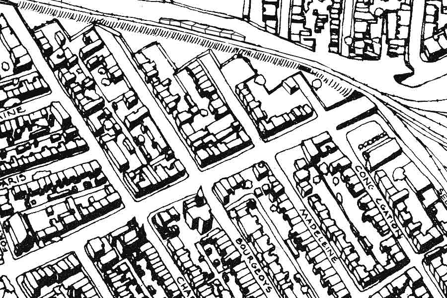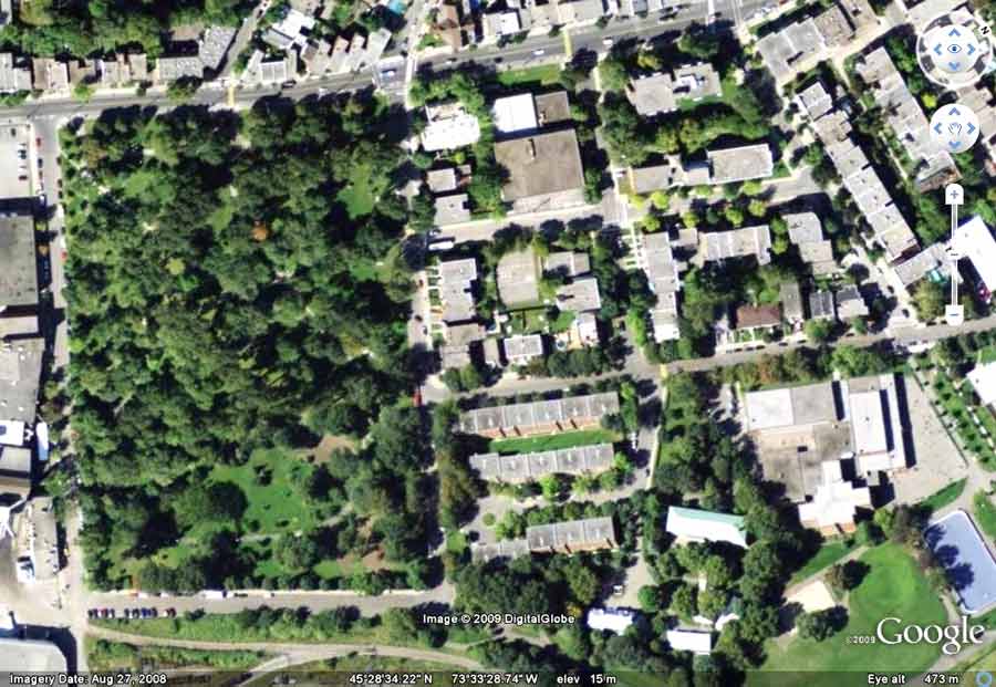This axonometric map of Pte. St. Charles, a district of Montreal, Canada, was drawn as part of a design course at the School of Architecture, McGill University, in the spring of 1972. Traced over a city map, heights of structures were determined by Pieter Sijpkes and me by riding along all the streets on our bicycles and recording the number of floors of every building. The map was part of a study Pieter and I did of open spaces in the community, with a view to seeing how they might be better used. The study was one activity of the Community Design Workshop, a community-based teaching program initiated by Professor Joe Baker. That summer Pieter and I obtained a federal government grant to hire local students to create adventure playgrounds and vegetable gardens on some of the underused land identified in the study. Our report about this project is online. Below each hand-drawn image is a corresponding Nov, 2009, image from Google Earth.