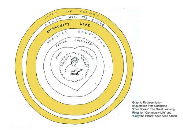 Lin Yu Tang (1895-1976) pointed out in 1935 in his book, “My Country and My People” that the Confucian teaching, the Great Learning, moves through the levels of social organization and leaves out community. He says that the jump from State to family is indicative; it shows unity and loyalty are operative at these two levels, but this sense is weak in between. He even says of public spirit, civic consciousness, and social service, "There are no such commodities in China"