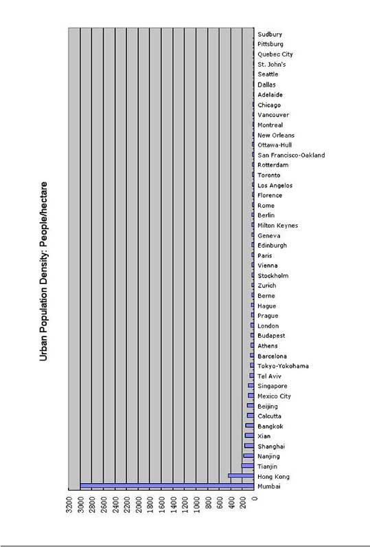 There are two important measures; one is the number of people per unit of land; and the other is the amount of indoor living-space per person. If we take the cities of Ottawa and Montreal, Canada, as examples of typical North American cities, we find an average of 40 people/hectare based on the gross built-up area of the city, and about 30m2 of living space per person. In a typical Chinese city we find an average of 100 people/hectare and about 20m of living space per person. If all are to be served with water, sewers, electricity, and transportation, then the more compact city is more economical, more energy-saving, and more sustainable.